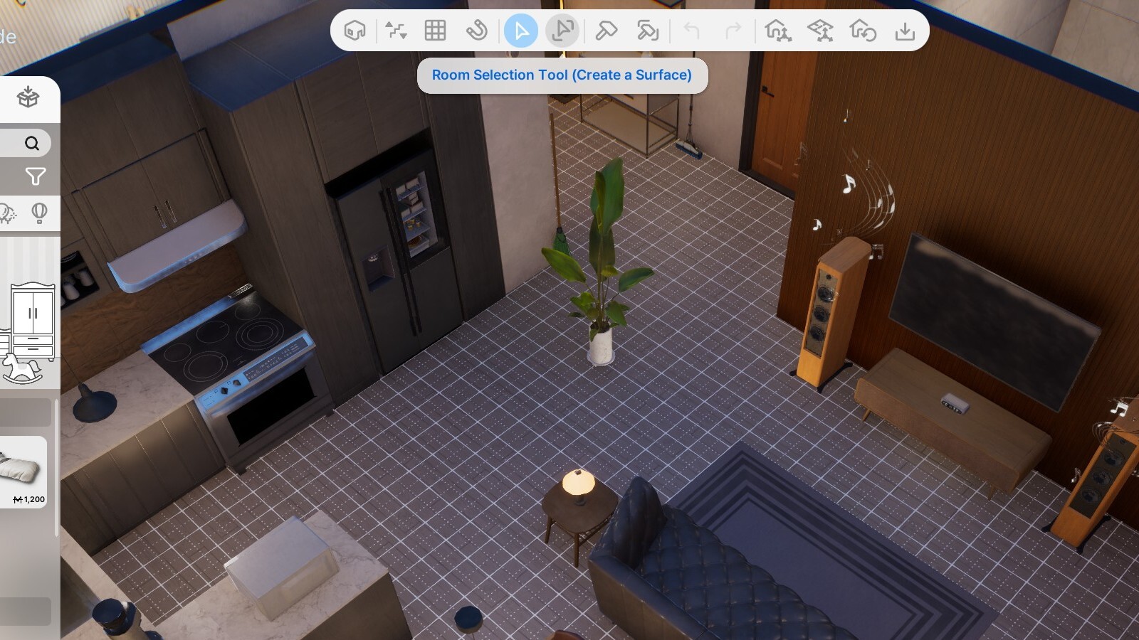 اولین تفاوت بزرگ این است که باید حالت انتخاب مناسب را فعال کنید. بهطور پیشفرض، نشانگر شما در حالت “ابزار انتخاب استاندارد” (Selection Tool) قرار دارد که به شما اجازه میدهد اشیای فردی مانند مبل را جابجا یا تغییر دهید. در این حالت، اگر دیواری را جابجا کنید، فقط همان دیوار حرکت میکند و اندازه اتاق تغییری نمیکند، مگر اینکه دیوار دیگر وجود نداشته باشد. برای تغییر اندازه اتاق یا بزرگ کردن خانهتان، باید به جای ابزار استاندارد، “ابزار انتخاب اتاق” (Room Selection Tool) را از نوار بالایی بخش ساخت و ساز انتخاب کنید.